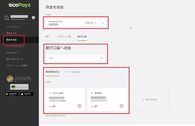 エコペイズから出金する方法は日本銀行口座への振込のみです。仮想通貨で入金した場合でも出金は銀行口座しか選択できません。