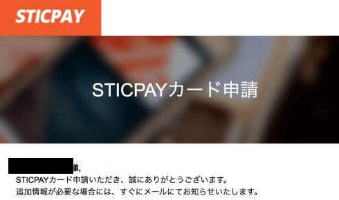 スティックペイカードの申し込みが完了すると、スティックペイから申請完了のメールが届きます。申請から承認、カード発送まで2~3週間かかるので、しばらくお待ちください。