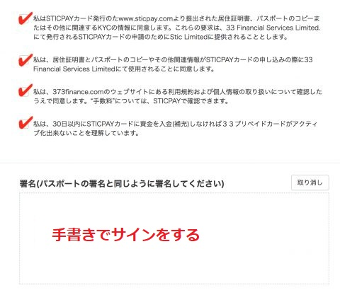 画像のアップロードが完了したら、4つの規約を確認し、同意欄にチェックを入れてください。最後に、一番下にある枠内にパスポートの署名と同じように指またはマウスを使って署名を入れたら手続き完了です。