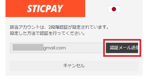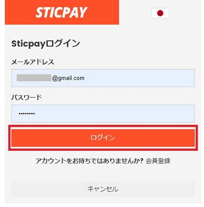 入金申請を行うと、スティックペイのログイン画面が自動で表示されます。登録したメールアドレス、パスワードを入力し、「ログイン」をクリックしてください。