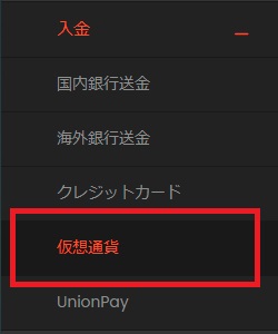 まず、ログインページ左側メニューで「入金」をクリックすると、入金で使用できる決済手段が表示されます。