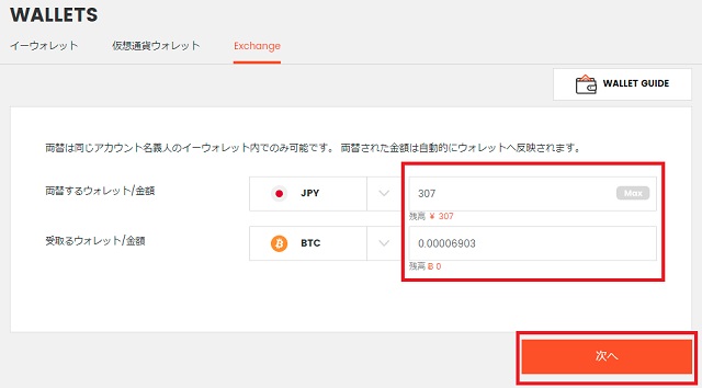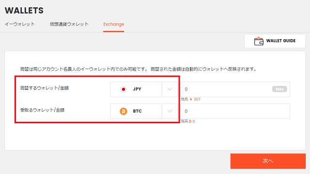 Exchangeページでは、両替するウォレット / 金額、受取るウォレット / 金額を設定します。