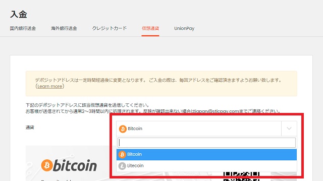 続いて、画面中央部にある仮想通貨選択メニューで入金に使用する「ビットコイン」を選択しましょう。