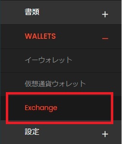 ログインページ左側メニューの「WALLETS」から「Exchange」をクリックしてください。