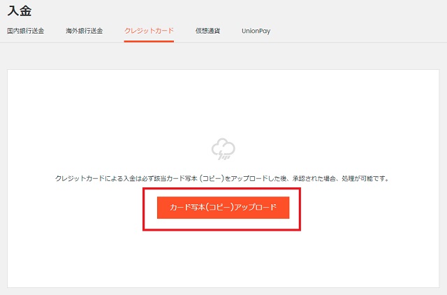 クレジットカード入金画面を開いたら、まずは「カード写本(コピー)アップロード」をクリックして、クレジットカード登録手続きを行いましょう。