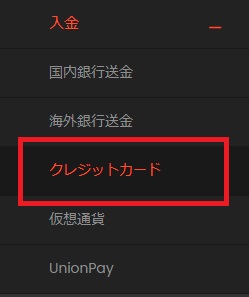 入金メニューをクリックすると、入金で使用できる決済手段一覧が表示されます。その中から「クレジットカード」を選択してください。
