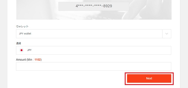 入金先のウォレット(例:JPY wallet)を選択し、Amountに入金したい金額を入力してください。。入金最少額は$10相当額で、日本円だと1,100円程度になります。入金額を入力したら、「Next」をクリックしましょう。
