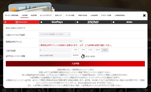 エルドアカジノの場合は「マイページ」⇒「入金申請」の順にクリックすると入金画面を開けます。