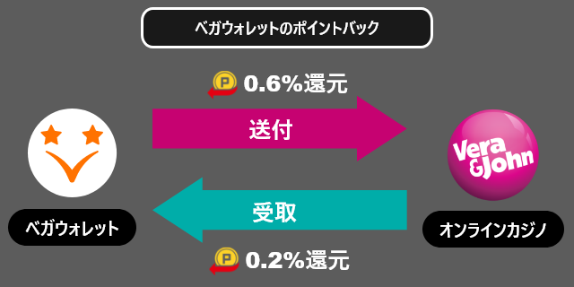 ベガウォレットを使ってオンラインカジノ入出金を行うと、入金時も出金時も決済額に応じてポイントバックがつきます。