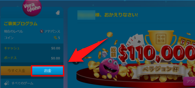 オンラインカジノで勝利金を獲得したら、「出金」メニューをクリックして出金画面を開いてください。