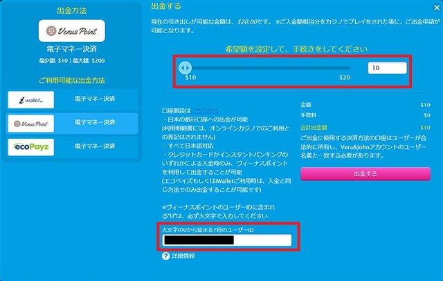 前述した通りの手順で、オンラインカジノからヴィーナスポイントへ入金できれば、反対にヴィーナスポイントからオンラインカジノへ入金できます。