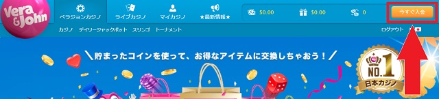 ベラジョンカジノの場合は画面上部のメニューにある「今すぐ入金」をクリックでOKです。
