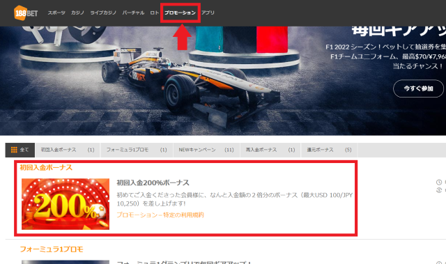 初回入金200%を受け取る方法は簡単です。まずは188BETにログインし、入金手続きを行ってください。入金手続きが完了したら、メニューからプロモーションページを開き、『初回入金200%ボーナス』を選択します。
