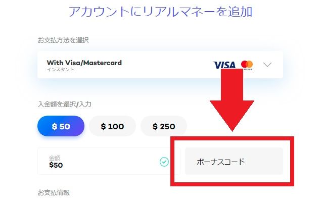 ボーナスコードを入力してから、入金手続きを実行してください。