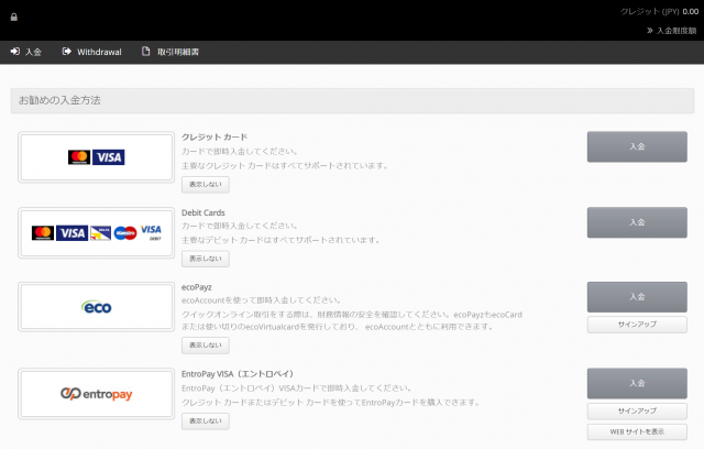 ログイン後、入金画面から「withdrawal」をクリックします。