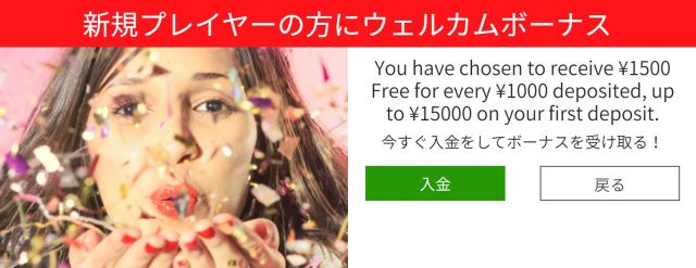 例えば、1000円の入金では1500円、2000円の入金では3000円と言うように金額に応じて最大15,000円までボーナスが獲得できます。