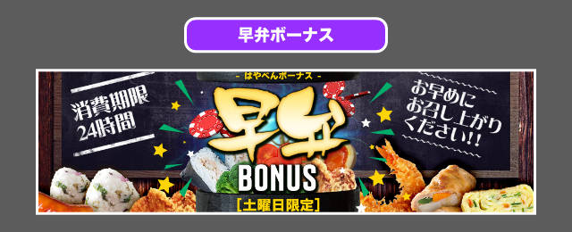 早弁ボーナスは、毎週土曜日限定で開催されるプロモーションです。ボーナスの種類や金額などがは、プロモーションメールにて毎週通知が来ます。ボーナスの消化期限は獲得から24時間以内で、クリアできない場合、勝ち金とボーナス額は自動で削除されるので注意してください。