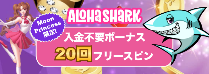 アロハシャークでは新規登録したプレイヤーを対象にMoon Princess(ムーンプリンセス)の20回フリースピンを入金不要ボーナス(登録ボーナス)として贈呈しています。(*スピンバリュー:$0.2)