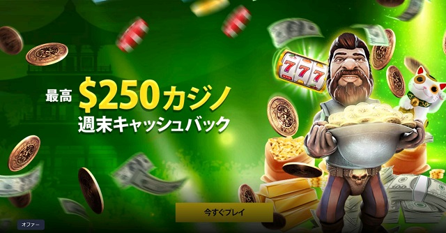 週末キャッシュバックとは毎週日本時間の金曜日から月曜日までに$250以上を入金し、カジノゲームで$250以上のベットを行うと、損失額の5%が最高$250キャッシュバックされるボーナスです。