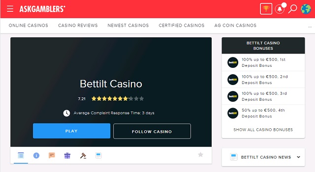 有名な海外オンラインカジノレビューサイト「Askgamblers」でベットティルトが紹介されているか調査しました。