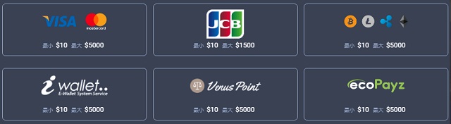 クレジットカード(入金のみ)、VenusPoint、ecoPayz、iWallet、仮想通貨です。