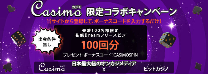 | Casimo限定登録ボーナス | フリースピン100回分 | 賭け条件なし | 48時間 |