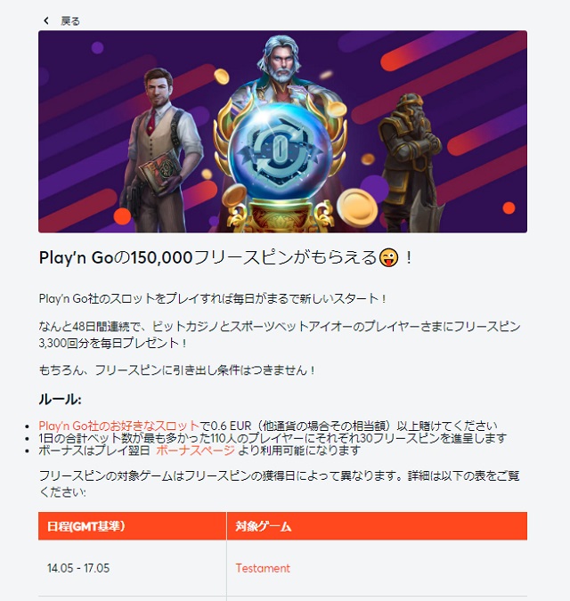 フリースピンボーナスがもらえるキャンペーンは定期的に開催しており、、現在は「Play’n Goの150,000フリースピンがもらえる?!」というキャンペーンをやっています。