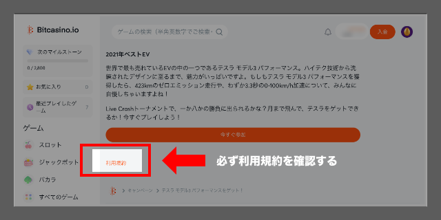 ビットカジノで何度かボーナスを利用すれば注意すべきポイントがわかるようになるかと思いますが、貰い慣れていないボーナスに関してはなるべく事前に利用規約を確認するようにしましょう。ボーナス獲得条件や禁止事項に関する記載は特に注意してください。