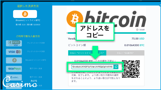 - 仮想通貨での入出金方法(例:ベラジョンカジノ)