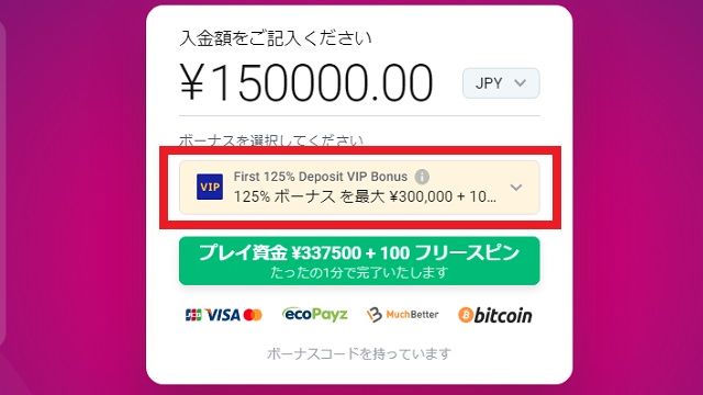 入金画面の入金額で法定通貨なら15万円以上、ビットコインなら0.15BTC以上入力すると、ボーナス選択欄がハイローラー用の「First 125% Deposit VIP Bonus」の表示に切り替わります。