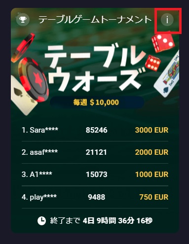 トーナメントの参加方法や競争方式・ルールは、プロモーションページにあるトーナメントカードの右上に表示されている「i」をクリックするとチェックできます。