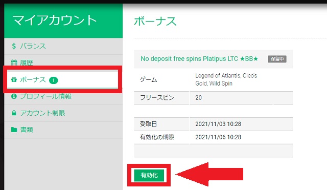 進呈されたフリースピンはボーナスページで有効化してからご利用ください。なお、フリースピン対象機種は随時変更されます。フリースピンがどの機種で遊べるかは、ボーナスページで確認しましょう。