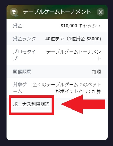 ベット上限等細かい規約は各トーナメントの「ボーナス利用規約」でご確認ください。