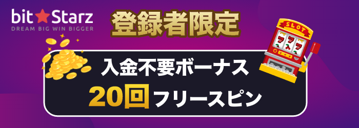 ビットスターズでは新規登録したプレイヤーに入金不要ボーナス(登録ボーナス)として20回フリースピンを進呈しています。(*対象機種は随時変更されます。)