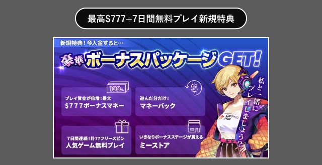 | ボーナス | ・$777+77回フリースピンウェルカムボーナス ・キャッシュミー ・いきなりボーナスステージ |
