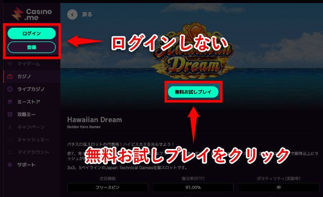 なお、カジノミーで無料プレイできるのはスロットとテーブルゲームです。ライブカジノはログインすれば配信画面を見られますが、無料では遊べません。