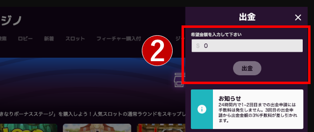 ただし、カジノミーで出金申請する際は24時間以内に2回までに留めましょう。24時間以内に、3回目の出金申請をすると手数料が3%課せられます。