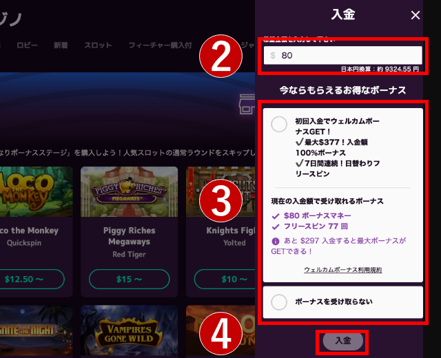 入金ボーナスがある場合は、入金額入力欄下にボーナス情報が表示されます。入金ボーナスを希望する場合はチェックを入れてください。