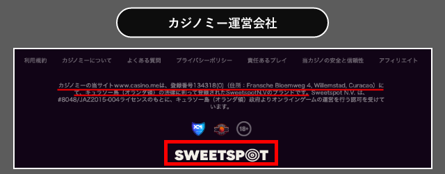 カジノミーはオランダ領キュラソー政府が認可する「Antillephone」ライセンスのもと、合法的に運営されているオンラインカジノです。運営会社SweetspotN.Vはオランダ領キュラソーに登録しています。