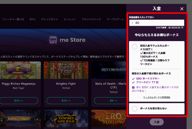 ウェルカムボーナスを希望する場合は、入金手続き時にボーナス申請を有効化する必要があります。
