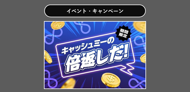 頻繁に開催されているイベント・キャンペーンは「キャッシュミー倍返し」です。キャッシュミー倍返しで対象となったスロットで遊ぶと、キャッシュミーを通常の1.5倍のスピードで積み立てられます。