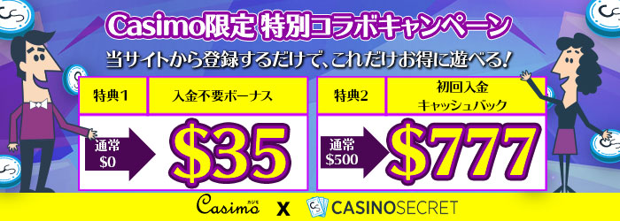当サイト限定で登録していただいたユーザー限定に$35の入金不要ボーナスと$777の初回入金キャッシュバックを贈呈しています。