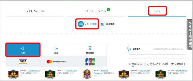 ここまでで「アカウントの登録」が完了し、あとは入金するだけでゲームが遊べるようになりました。