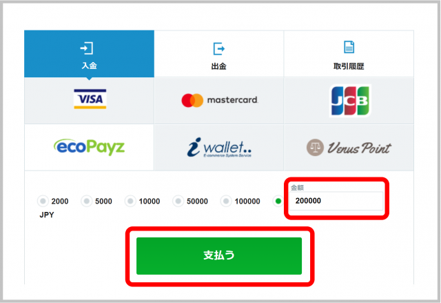 初回で200,000円入金した場合、ボーナス分と合わせて倍額の400,000円を軍資金にできるので非常にお得です。