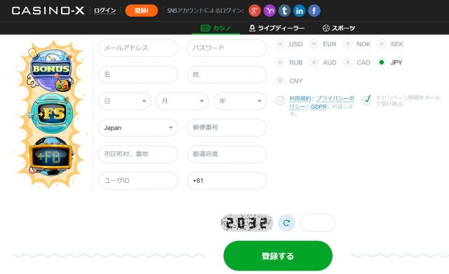 カジノエックスは完全日本語対応ですので、スマホ・PC両方から日本語での登録が可能です。