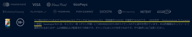 | ソフトウェア | 2by2 Gaming / BigTimeGaming / Blueprint / Cayatano / EvolutionGaming / Gamatron / Gamomat / Golden HeroGames / Habanero / iSoftBet / Just For The Win / KalambaGames / LightningBox / Lotus Gaming / Microgaming / NetEnt / NolimitCity / OryxGaming / Play’nGo / PocketGames / PragmaticPlay / PushGaming / Rabcat / RedTiger / RelaxGaming / SA Gaming / Slingo Originals / STHLM Gaming / Thunderkick / Yggdrasil |