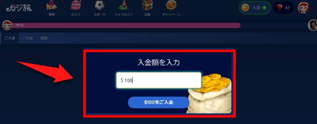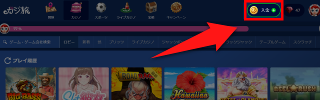 入金ページは、カジ旅のログインページ上部にある「入金」をクリックすれば一発で開けます。