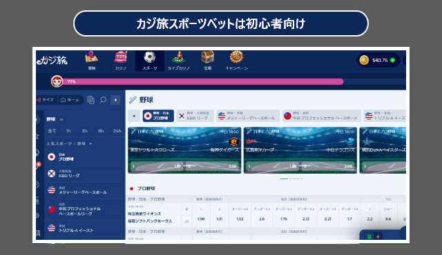 カジ旅のスポーツベットは初心者向けです。初めての人でも利用しやすいよう完全日本語対応していますし、Jリーグやプロ野球など国内開催の試合オッズが把握しやすい設計となっています。