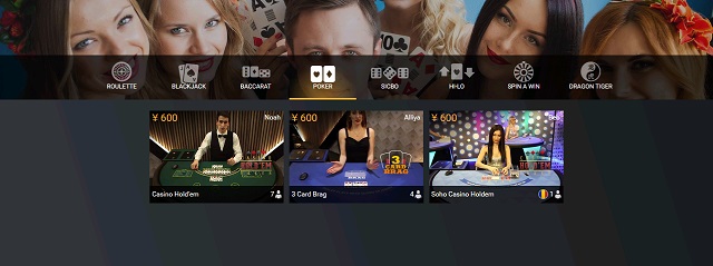| ポーカーの種類 | ・Casino Hold’em ・3 Card Brag ・Soho Casino Hold’em |