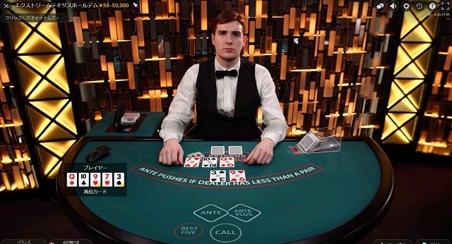 おすすめのポーカーはエボリューションライブの「エクストリームテキサスホールデム」で、細かいベット調整がしやすく、ボーナスベットもあるので、本格的なテキサスホールデムが好きな方でも気に入ると思います。